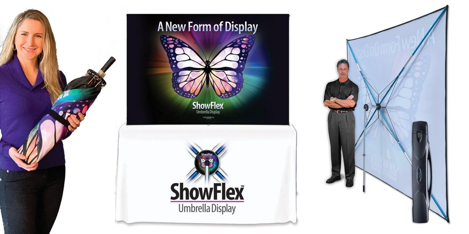Our innovative ShowFlex system is an ultra-light and ultra-portable umbrella style display that sets up and down in seconds. Full color, wrinkle resistant, and graphics that stay attached are just a few of the benefits the ShowFlex system offers.
