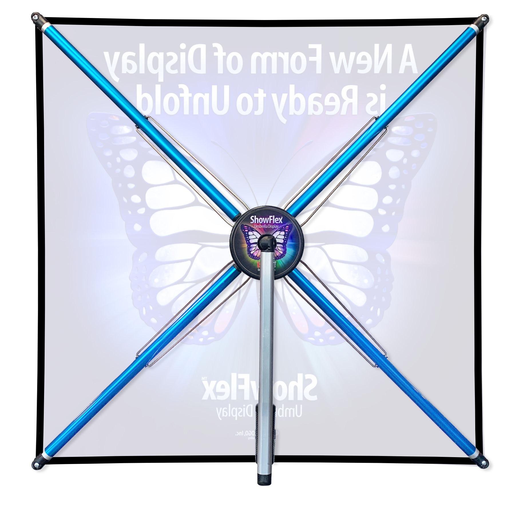 The ShowFlex tabletop opens and closes like an umbrella, sets up in seconds and features vibrant dye-sub graphics that remains attached when closed. Includes nylon travel bag.