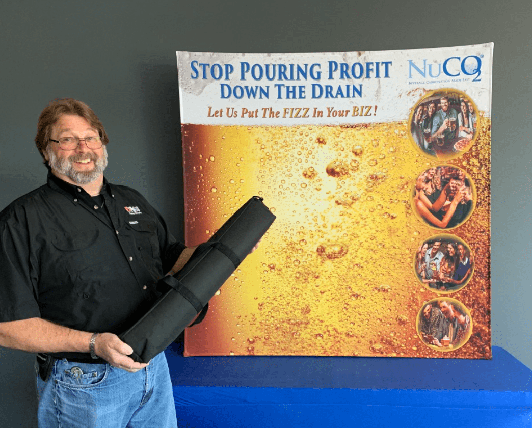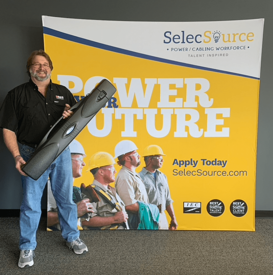 Rick (our production manager) dwarfed by the massive 72" wide x 117" tall ShowFlex F3. Travels in our 39" bannercase and weighs 12 lbs. when packed!