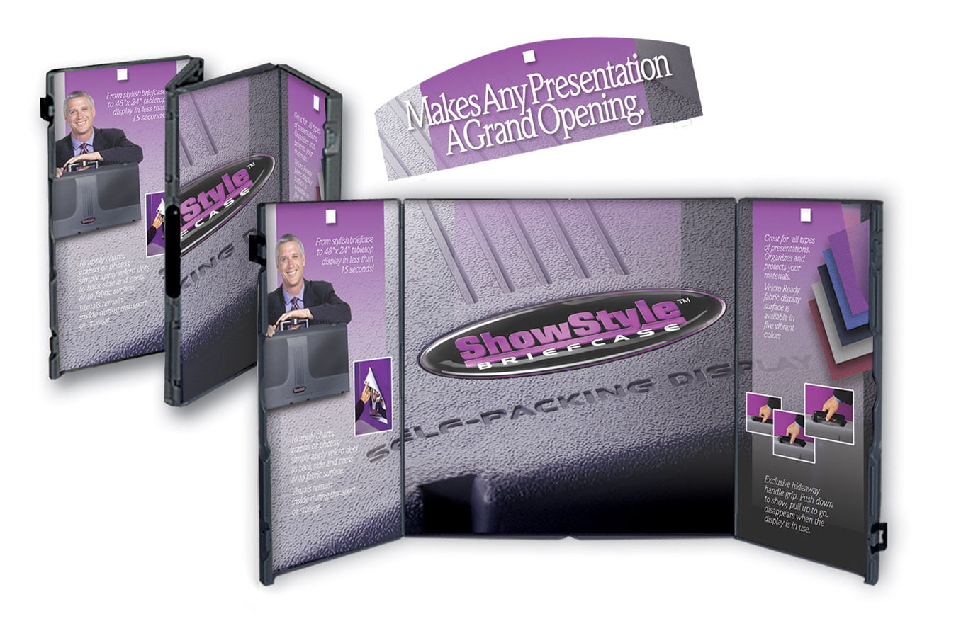 Pictured is a ShowFlex Trio: 92” x 92” center section with two 38” x 92” side panels, sets up in less than three minutes.