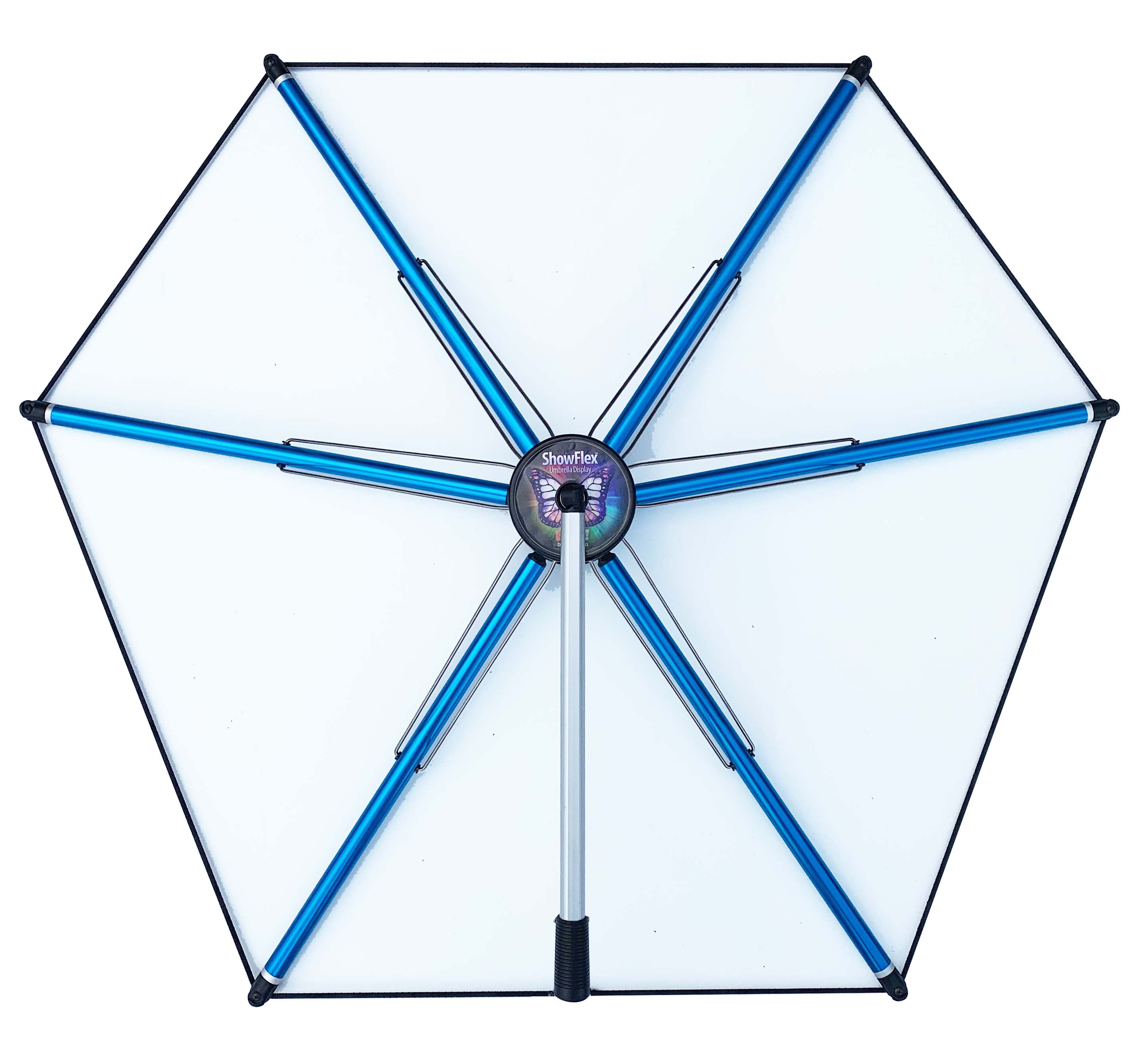 The ShowFlex tabletop opens and closes like an umbrella, sets up in seconds and features vibrant dye-sub graphics that remains attached when closed. Includes nylon travel bag.
