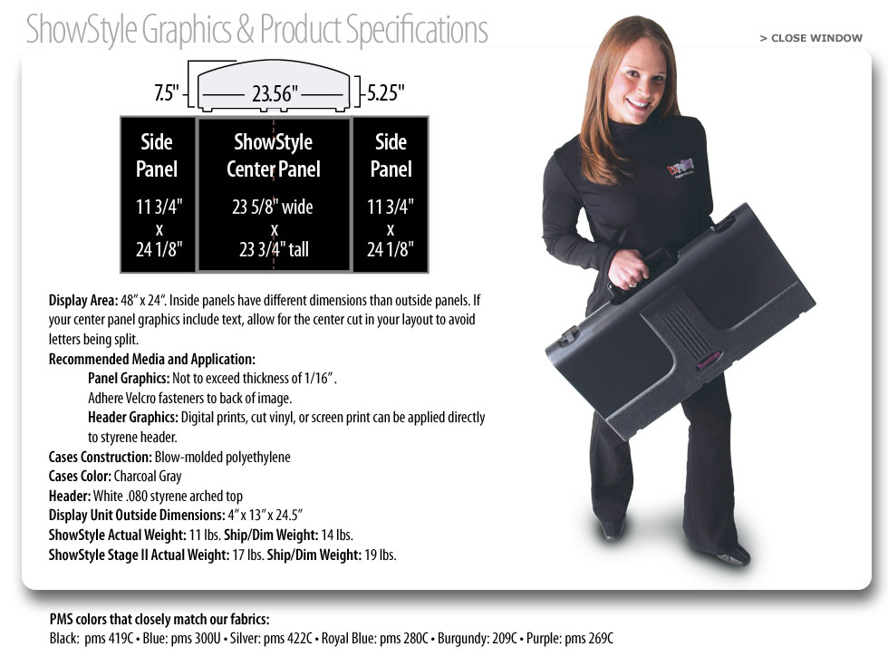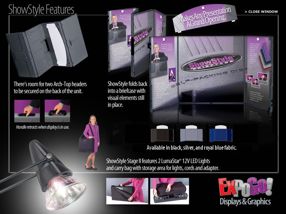 The ShowStyle® Briefcase Display standard package includes the tabletop unit in your choice of three fabric colors and a blank header. Your photos, charts and graphics attach to the fabric panels with Velcro®. Then after your presentation, ShowStyle® folds back into a “briefcase” with all the attached visual elements still in place.